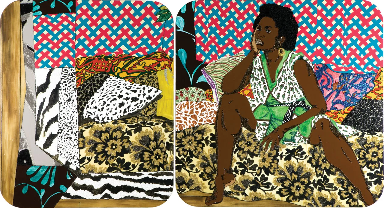 Baby I Am Ready Now, 2007, Mickalene Thomas, acrylic, rhinestone and enamel on panel, diptych, overall 72 x 132 in. (182.9 x 335.3 cm), acquired in 2007