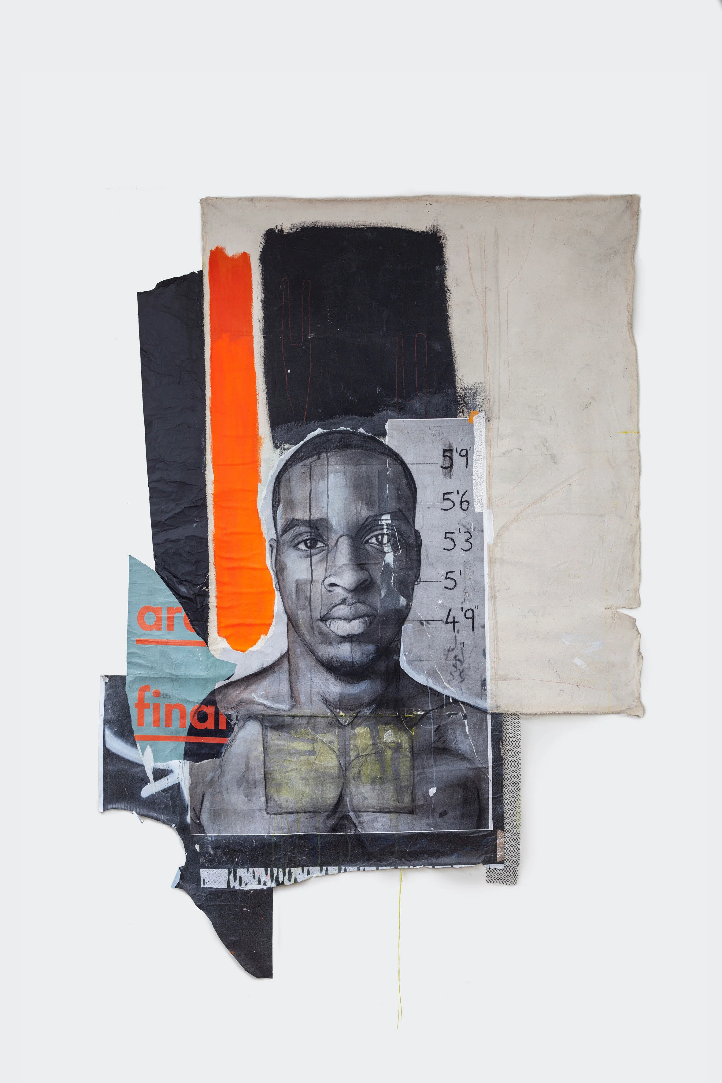 No. 46664 (2018), Acrylic, graphite, pastel, tape, metal chain, rubber, string and scavenged billboard on canvas.