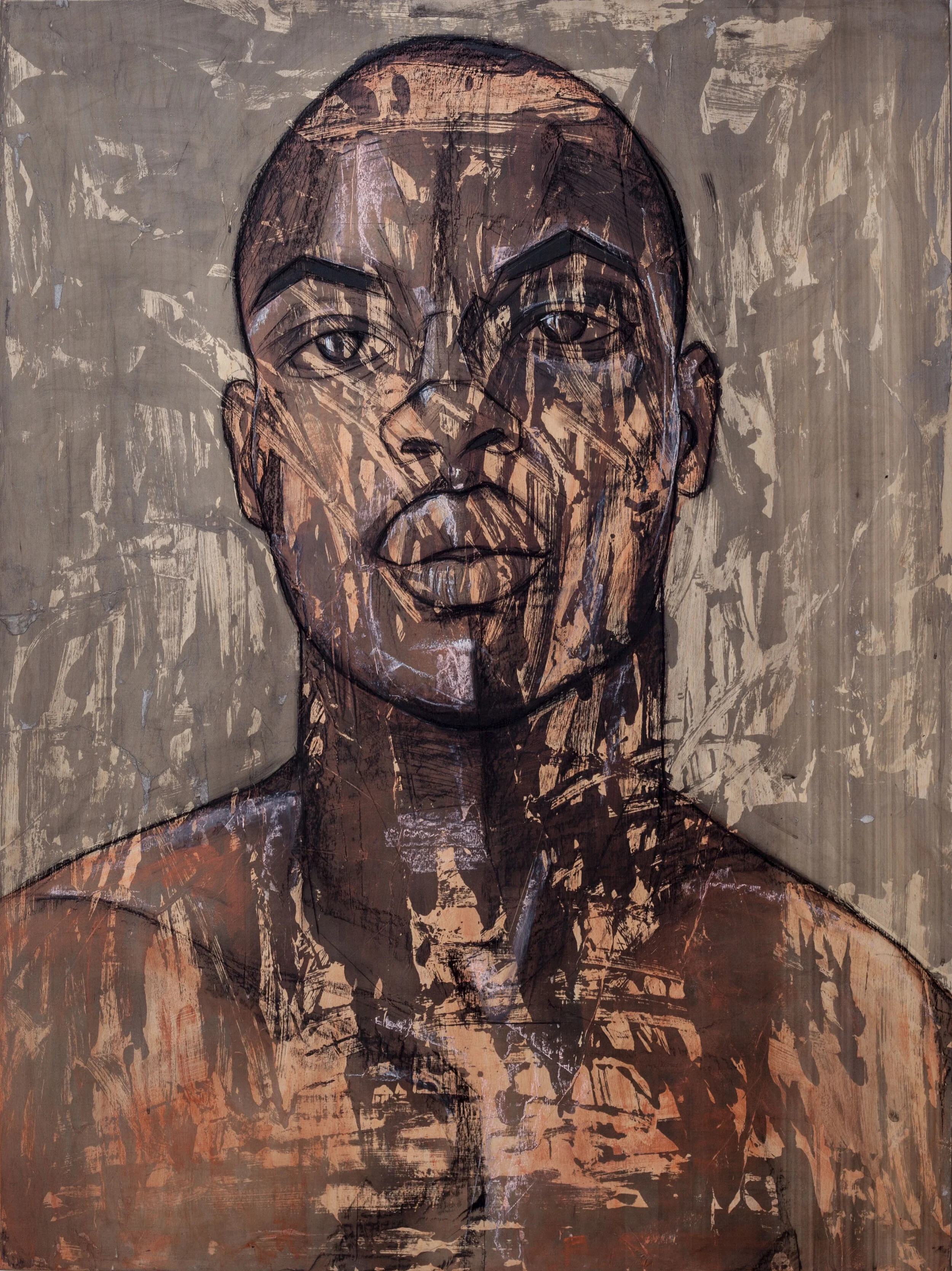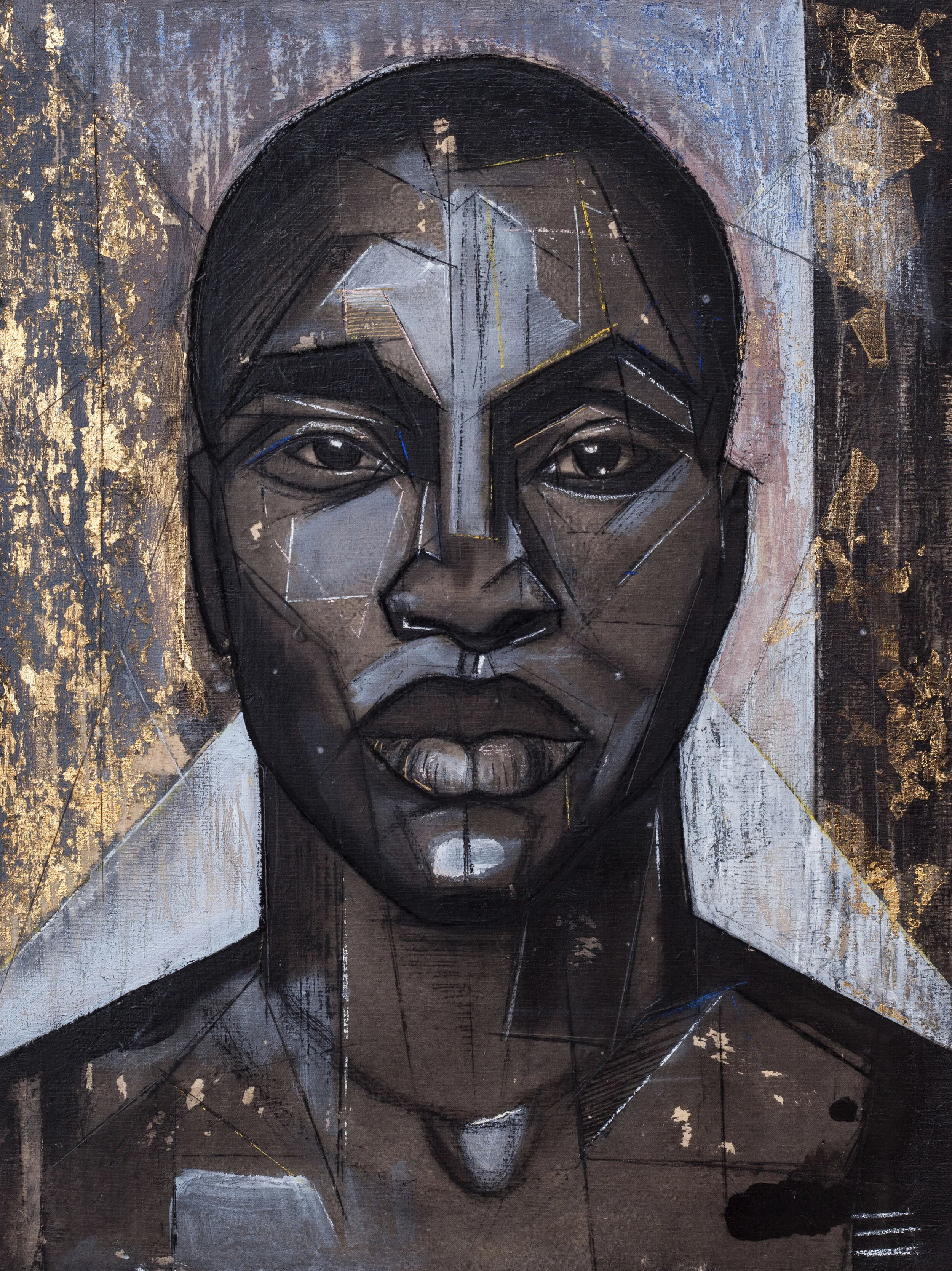 Anthony, Acrylic, Charcoal, Pastel, Oil Pen and Gold Leaf on Wood Panel, 18 x 24 inches